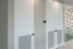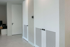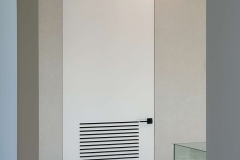 Some of the doors were crafted with discreet linear openings within the slab, allowing air circulation for the air-conditioning system while preserving the clean, uninterrupted look of the interiors. The master bedroom entrance features a pivot door on a hidden frame, creating a bold yet elegant statement in the heart of the residence.