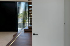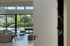 This private residence in Hollywood is furnished with frameless interior doors finished in white Italian enamel, complemented by white concealed hinges for a perfectly flush appearance. The minimalist design integrates seamlessly with the architecture, while black handles provide a refined contrast that defines the modern character of the home.