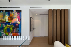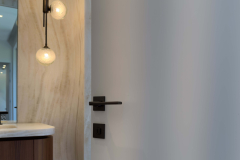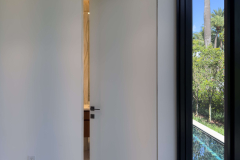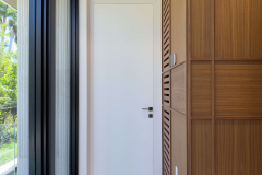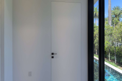 This Miami residence features frameless interior doors in white Italian enamel, designed with white aluminum jambs and concealed hinges for a seamless flush look. The minimal white surface blends with the walls, while black handles add a refined contrast, highlighting the contemporary aesthetic.